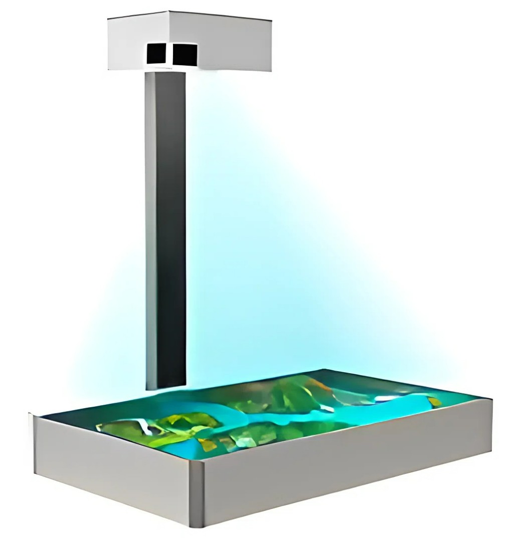 Позволяет не только развивать мелкую моторику ребенка, получать тактильные ощущения от игры, но и взаимодействовать с его фантазией, творческим потенциалом. Как это работает. На поверхность песочницы проецируется природный ландшафт. Как только ребенок меняет высоту горки или глубину ямки, перемещает кучки песка - песочница откликается и обрисовывает на поверхности песка новые горы, вулканы, озера, реки и протоки.